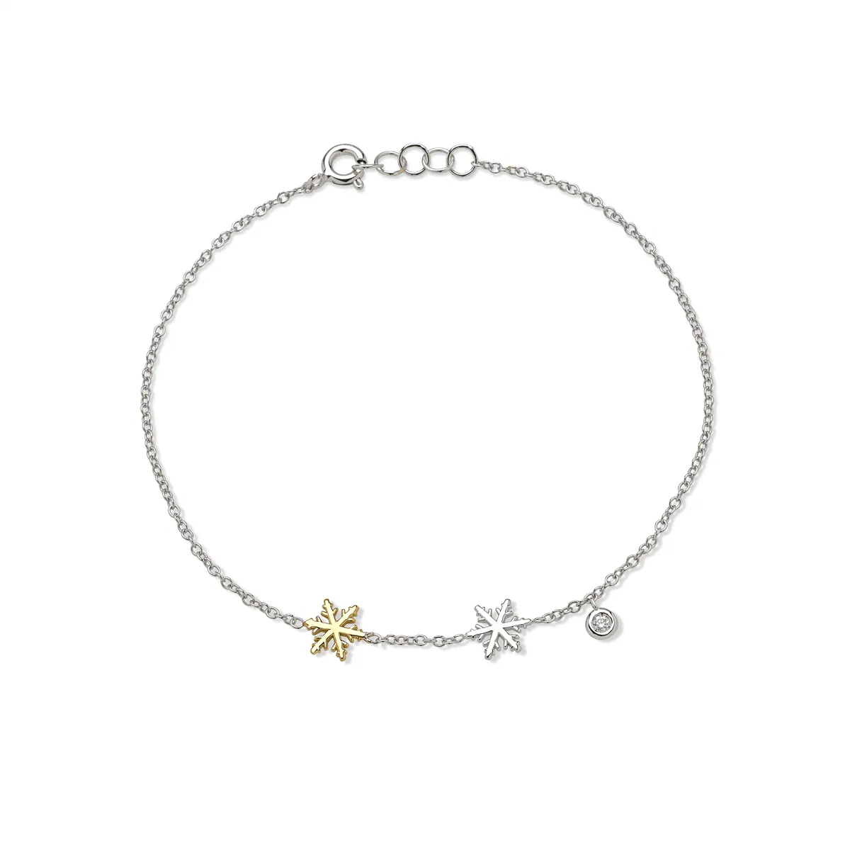 Inspiré par la douceur des sommets et la finesse des flocons de neige, le bracelet Flocons d’Amour en or blanc et jaune 750 mill. serti d'un diamant naturel, incarne une élégance discrète et poétique. Sa ligne délicate et sa symbolique forte en font un bijou pensé pour traverser le temps avec grâce.